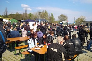 An der Tankstelle vor Lichtenberg haben wir noch einen kleinen Stop eingelegt um einen kleinen Kaffee zu trinken und etwas die Beine zu vertreten. Zum Glück. Bei einem unser Gastbiker hat sich der Benzinschlauch gelöst. Ehe der Fehler bemerkt und behoben werden konnte, hatte sich allerdings eine ganze Menge der kostbaren Flüssigkeit, getrieben von der Anziehungskraft der Erde, in die selbige begeben. Dickes Bike braucht eben viel Sprit, aber sollte er nicht in der Brennkammer landen? (lol)