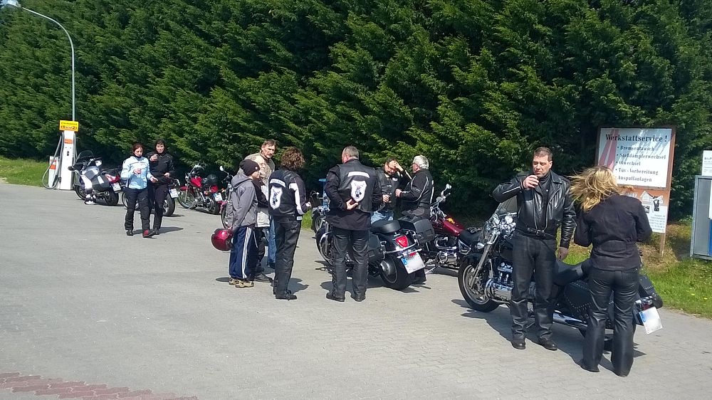 An der Tankstelle vor Lichtenberg haben wir noch einen kleinen Stop eingelegt um einen kleinen Kaffee zu trinken und etwas die Beine zu vertreten. Zum Glück. Bei einem unser Gastbiker hat sich der Benzinschlauch gelöst. Ehe der Fehler bemerkt und behoben werden konnte, hatte sich allerdings eine ganze Menge der kostbaren Flüssigkeit, getrieben von der Anziehungskraft der Erde, in die selbige begeben. Dickes Bike braucht eben viel Sprit, aber sollte er nicht in der Brennkammer landen? (lol)